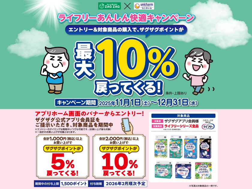 | ザグザグ公式アプリ会員様限定! 『 ライフリーあんしん快適キャンペーン 』 アプリ会員証をご提示のうえ、対象商品をご購入でザグザグポイント最大10%戻ってくる! |