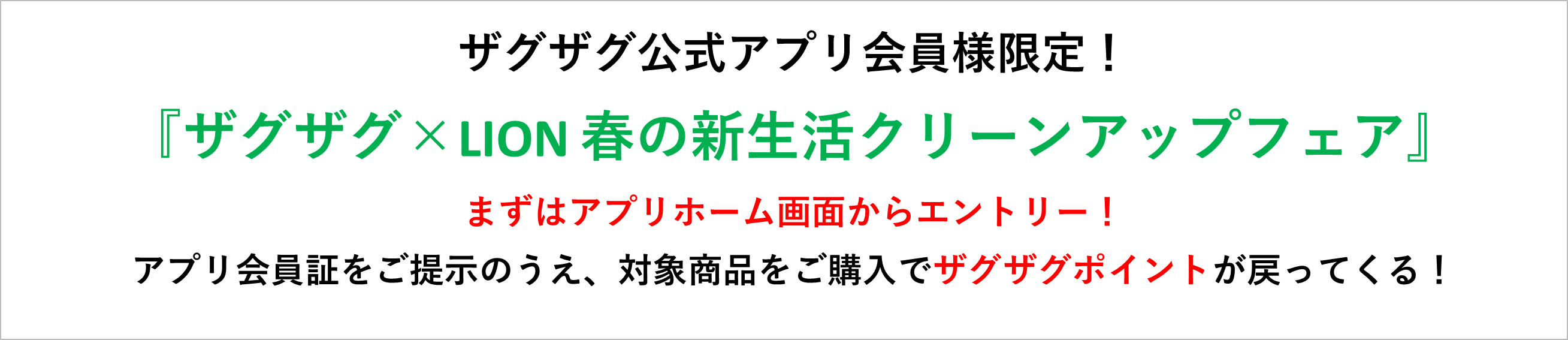 ・本キャンペーンへの参加は、キャンペーン期間中にザグザグ公式アプリホーム画面よりエントリーをいただく必要がございます。 (エントリーのタイミングはキャンペーン期間中であれば、対象商品のお買上げ後でも可能です。) ・お会計の際にザグザグ公式アプリ会員証をご提示いただいた方が対象となります。ザグザグ公式アプリのご利用について、詳しくはコチラ ・ポイント付与前にザグザグポイントカードやアプリを退会された場合、付与の対象外となりますのでご注意ください。 ・本キャンペーンは、予告なく変更または中止する場合があります。 |