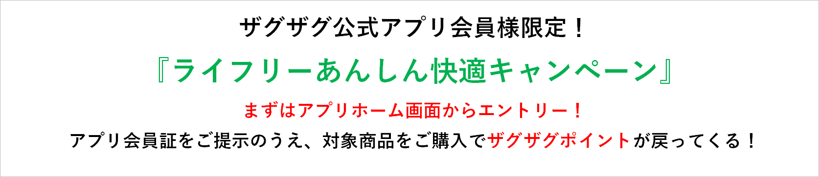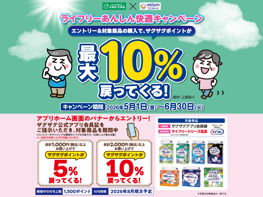 ・本キャンペーンへの参加は、キャンペーン期間中にザグザグ公式アプリホーム画面よりエントリーをいただく必要がございます。 (エントリーのタイミングはキャンペーン期間中であれば、対象商品のお買上げ後でも可能です。) ・お会計の際にザグザグ公式アプリ会員証をご提示いただいた方が対象となります。ザグザグ公式アプリのご利用について、詳しくはコチラ ・ポイント付与前にザグザグポイントカードやアプリを退会された場合、付与の対象外となりますのでご注意ください。 ・本キャンペーンは、予告なく変更または中止する場合があります。 |